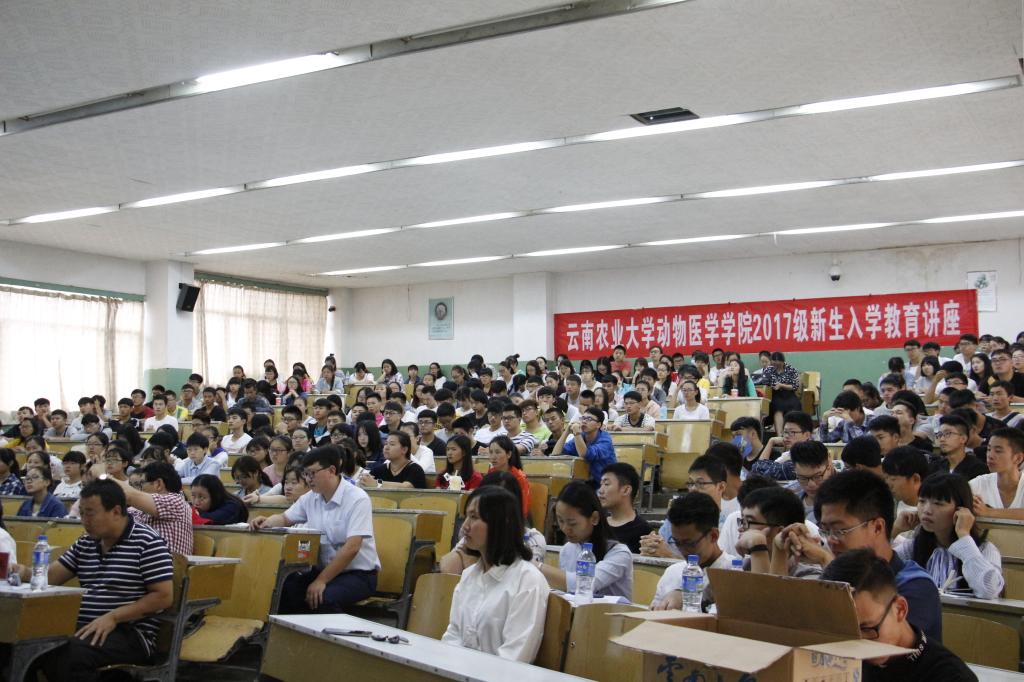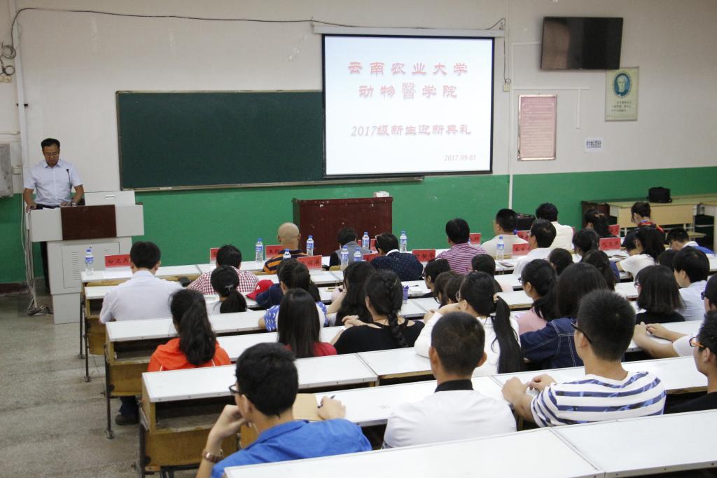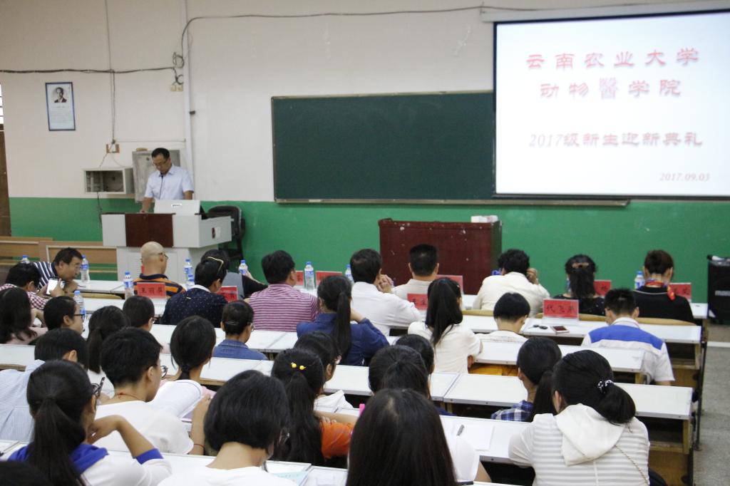 在迎新典礼上,杨亮宇书记代表学院全体师生对2017级新生的到来表示热烈欢迎。首先杨书记为同学们详细介绍了学院的发展历史、专业学科建设、师资力量、科研水平及发展前景等方面。其次是尹革芬副院长为大家介绍了本科学生人才培养方案、课程设置、学业生涯规划等。最后是由兽医院院长肖啸教授为同学们做了一场幽默诙谐、热情洋溢的专业介绍讲座,同学们深受鼓舞,对动物医学专业产生浓厚的兴趣。