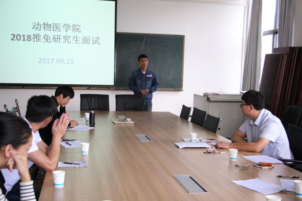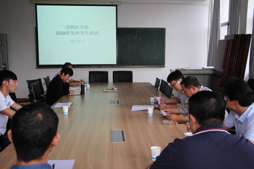 9月13日上午,yl23411永利集团官网登录副院长尹革芬、副书记曲伟杰、段纲教授、临床兽医系系主任李海昌、预防兽医系孙永科及团委老师组建推免生遴选小组,对4名2014级免试攻读硕士学位研究生候选人进行现场面试选拔。