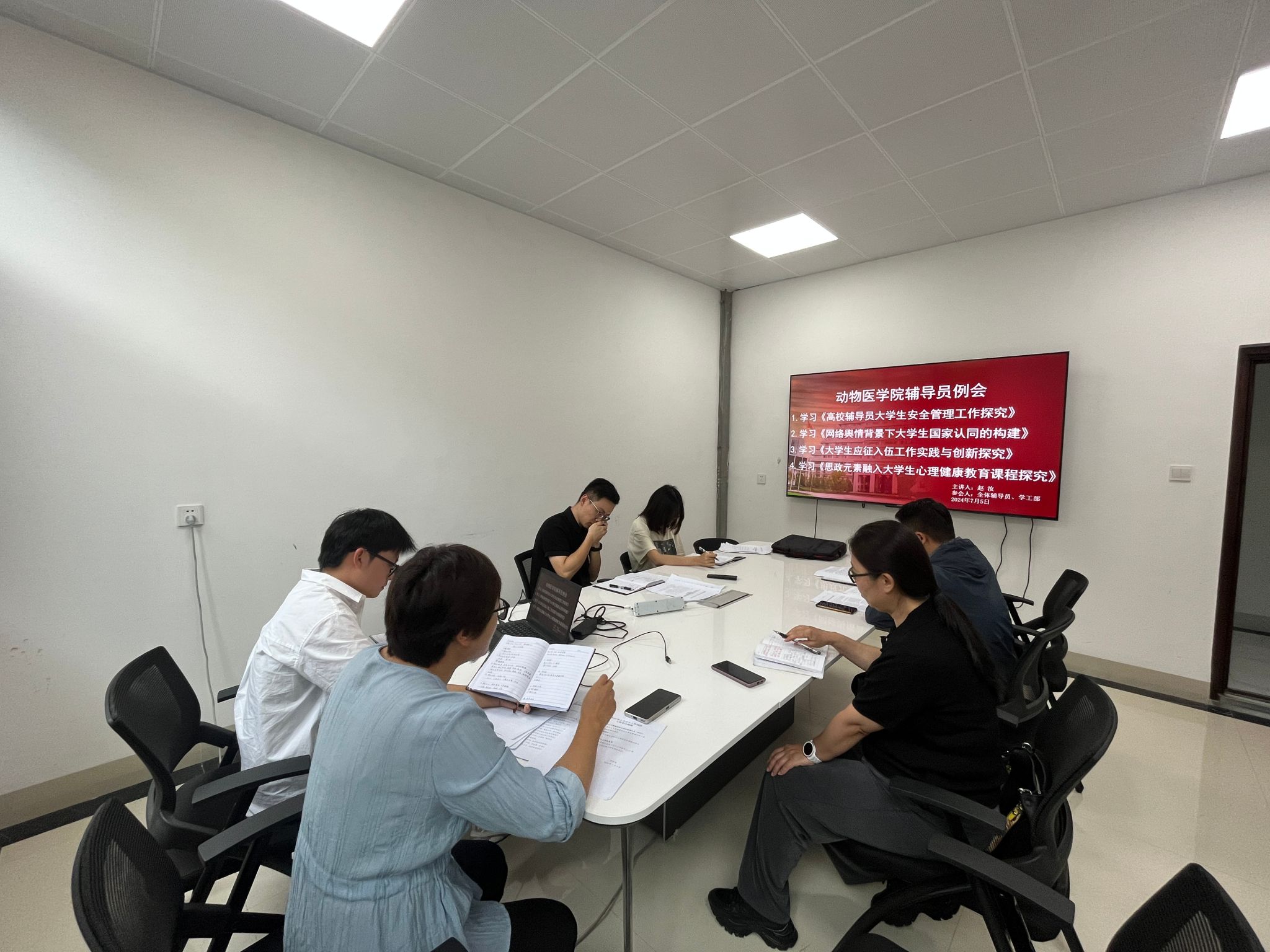 会上,先由赵汝带领学习《高校辅导员大学生安全管理工作探究》、《网络舆情背景下大学生国家认同的建构》、《大学生应征入伍工作实践与创新探究》、《思政元素融入大学生心理健康教育课程探究》,并提交学习心得。